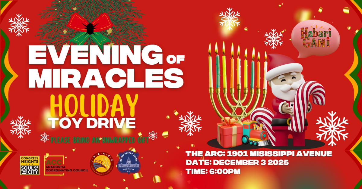 Este diciembre, el espíritu de generosidad brillará en el Distrito de Columbia con la campaña anual de donación de juguetes del Departamento de Policía Metropolitana, apoyada por el Anacostia Coordinating Council. El evento, titulado “Una Noche de Milagros”, será organizado por Building Bridges Across the River en THEARC y co-patrocinado por Soul of the City BID, celebrando la unidad, la fe y la solidaridad en la comunidad.