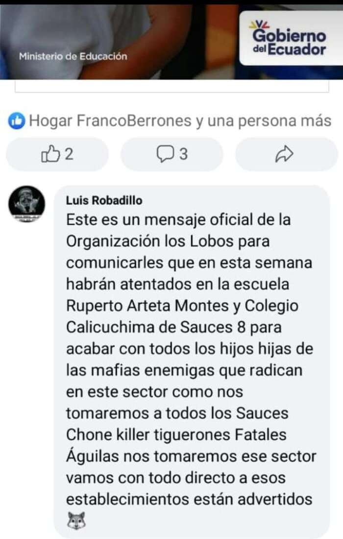 El fenómeno no se limita a Instagram. En Facebook, una publicación atribuida a un usuario identificado como “Luis Robadillo” advierte sobre supuestos atentados en la “escuela Ruperto Arteta Montes” y el “colegio Calicuchima de Sauces 8”, mencionando a varias agrupaciones: “Los Lobos”, “Tiguerones”, “Águilas” y “Fatales”. El mensaje concluye con una advertencia: “vamos con todo directo a esos establecimientos están advertidos”.