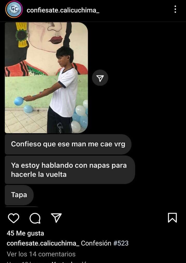 Una de estas plataformas fue la cuenta de Instagram “confiesate.calicuchima_”, un espacio de publicaciones anónimas que funcionaba como buzón de mensajes entre estudiantes. En ese entorno, Rick no solo pudo ser objeto de burlas, sino que también otros estudiantes eran expuestos. En dicha cuenta incluso se identificaba directamente a un estudiante de la institución.