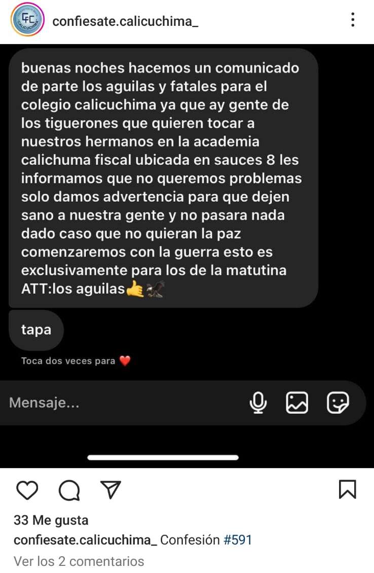 En otra publicación de la misma cuenta, el tono escala aún más. El mensaje, atribuido a un grupo autodenominado “los águilas”, advierte: “hay gente de los tiguerones que quieren tocar a nuestros hermanos… si no quieren la paz comenzaremos con la guerra”. La referencia directa a Los Tiguerones introduce un elemento crítico: la incorporación del lenguaje de bandas criminales dentro del discurso cotidiano de estudiantes.