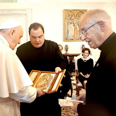El Papa Francisco, ecónomo Alejandro Keri Zeppenfeldt y el sacerdote Luis Ugalde durante la entrega de una Virgen de Coromoto en junio de 2021