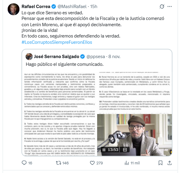Toda la maquinaria correísta se puso en marcha. Incluso el propio ex presidente prófugo, Rafael Correa, retwitteó el mensaje de José Serrano en el que a su vez coloca el video de Boscán.
