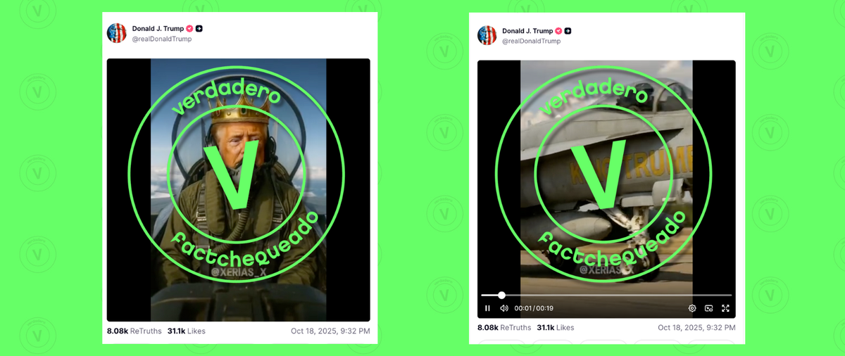 El sábado 18 de octubre de 2025, el presidente Trump compartió en Truth Social un video generado con IA donde aparece piloteando un jet militar con las palabras «King Trump» y arrojando una sustancia marrón como si fuera excremento sobre manifestantes de las protestas «No Kings» («Sin Reyes”) en contra de las tendencias autoritarias de su gobierno. Trump llamó a las protestas «una broma» y acusó, sin mostrar pruebas, al empresario George Soros de financiarlas. La Casa Blanca amplificó contenido elaborado con IA en el que muestra a líderes demócratas con sombreros mexicanos. Entre el 18 y el 19 de octubre de 2025, se realizaron alrededor de 2,600 protestas “No Kings” en casi todos los estados del país, con una convocatoria estimada en varios millones, de acuerdo con los organizadores de la protesta y medios como NPR, The New York Times y NBC.